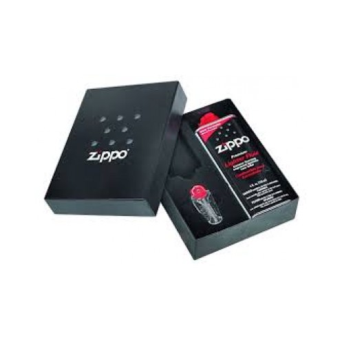 Poklon kutija za zippo upaljač (klasični široki) koja sadrži zippo benzin i kremen. Bez upaljača. Zippo benzinski upaljač Model: Zippo Poklon Kutija Proizvođač: Zippo, 33 Barbour street, Bradford PA, 16701 Uvoznik: Obrt za trgovinu Happy, Borelli 4, 23000 Zadar